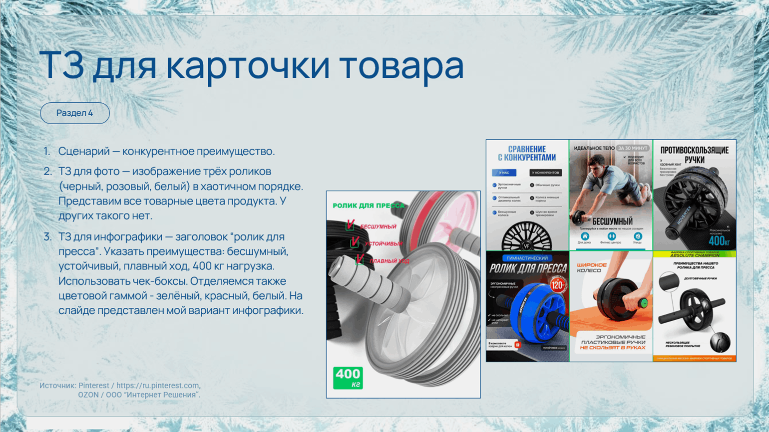 Особенно меня впечатлила работа с карточками товаров. На первый взгляд, это похоже на веб-дизайн: создаёшь визуально привлекательное изображение, подбираешь шрифты, цвета, логотип. Но тут свои законы. Если сравнивать с дизайном сайтов, где важны зональность, модули и «воздух», то в карточке товара нужно максимально компактно донести информацию через фото, цифры, фразы. Это совсем другой опыт для мозга.