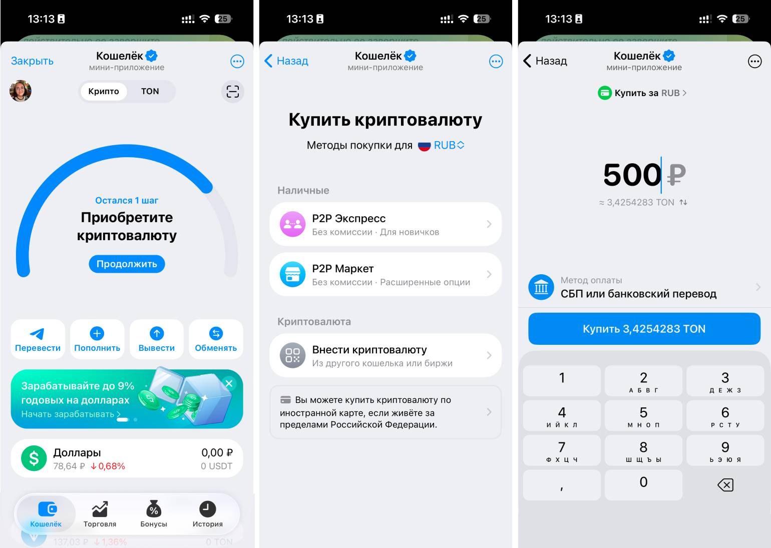 Кошелёк появится в вашем профиле Telegram. Чтобы пополнить его, откройте мини-приложение «Кошелёк» и пройдите верификацию по паспорту в нём тоже. После этого на главном экране выберите вкладку «Крипто» — «Пополнить» — «P2P Экспресс» — Toncoin. Это нужно для того, чтобы провести сделку с другим пользователем. Выберите, каким способом вы сделаете перевод, — например, через СБП. После этого нажмите на «Купить» и дождитесь подходящего предложения от продавца. Он переведёт вам криптовалюту, а вы ему — рубли.