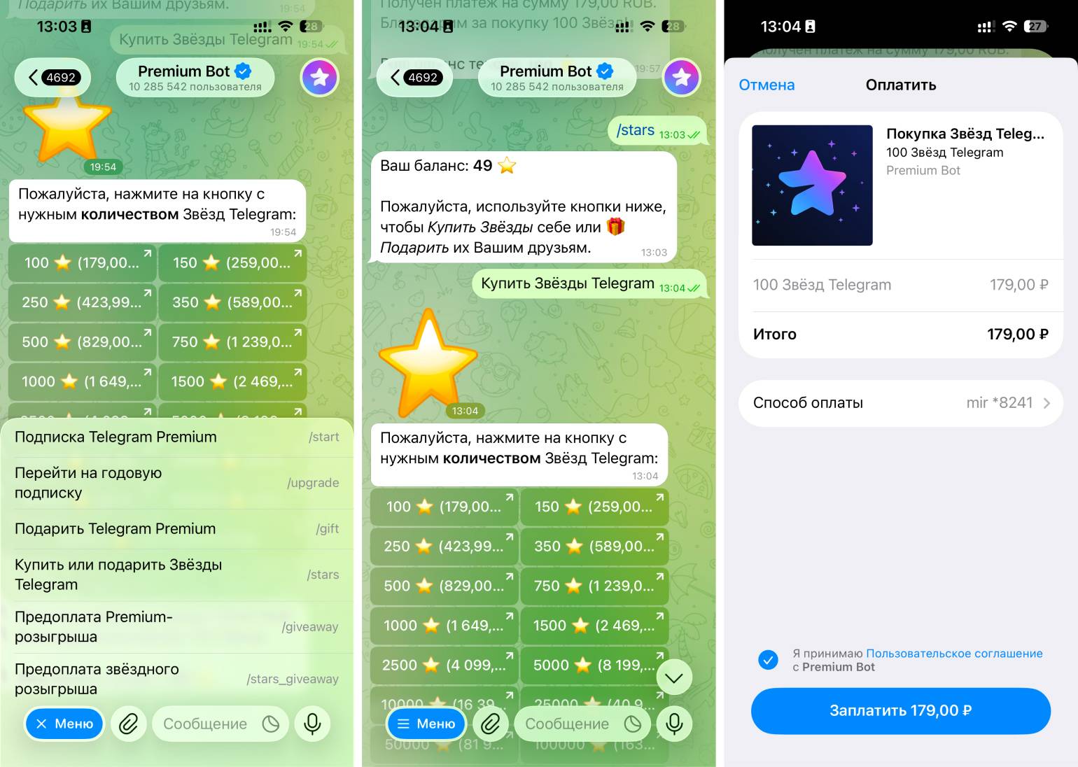 Premium Bot от команды Telegram. @PremiumBot — самый выгодный способ пополнять баланс в Telegram. Например, 100 звёзд в нём стоят 179 рублей.