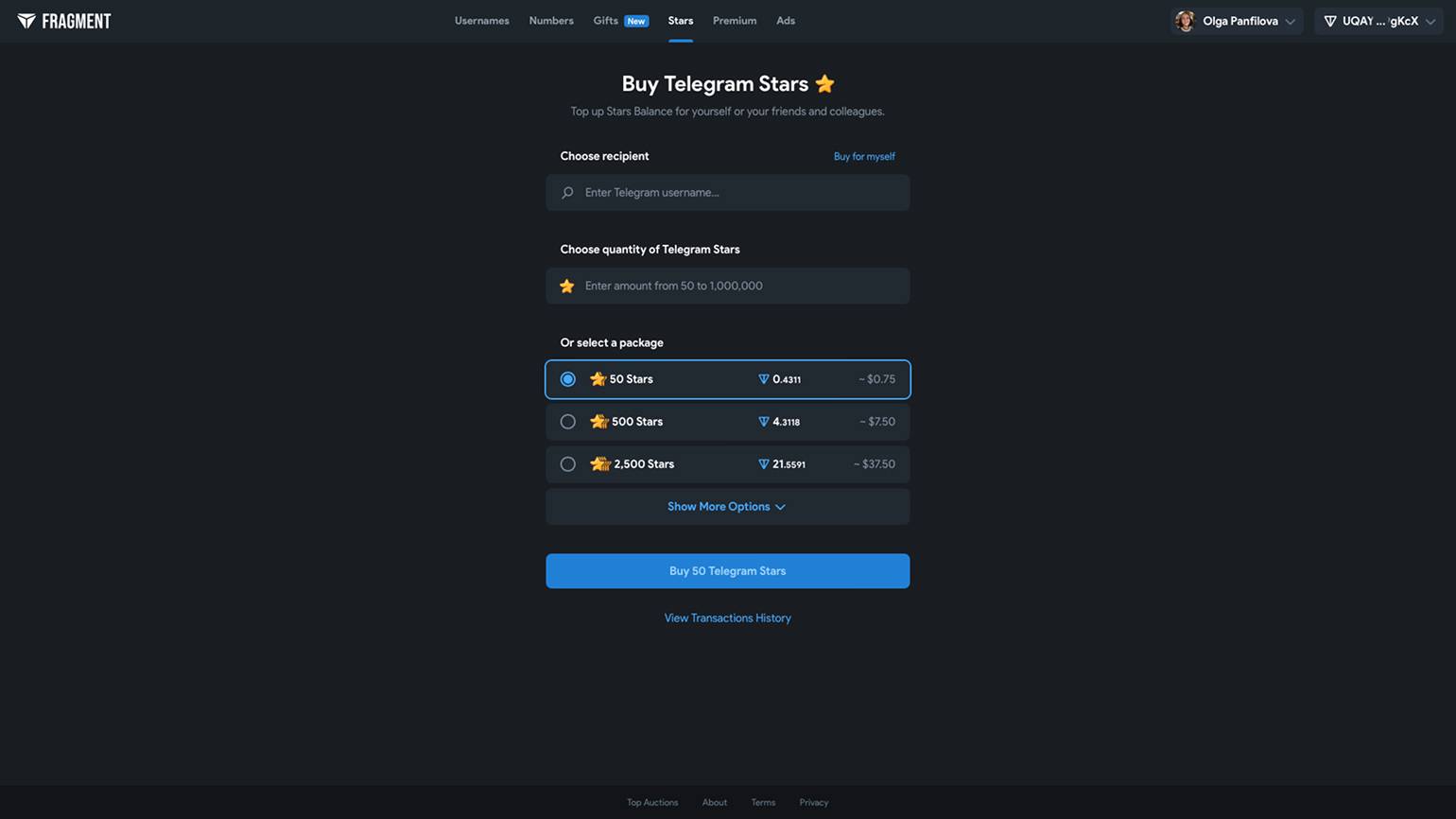 Затем перейдите на сайт Fragment в раздел Stars, нажмите Buy Stars Package и выберите, какому пользователю и сколько звёзд хотите начислить.
