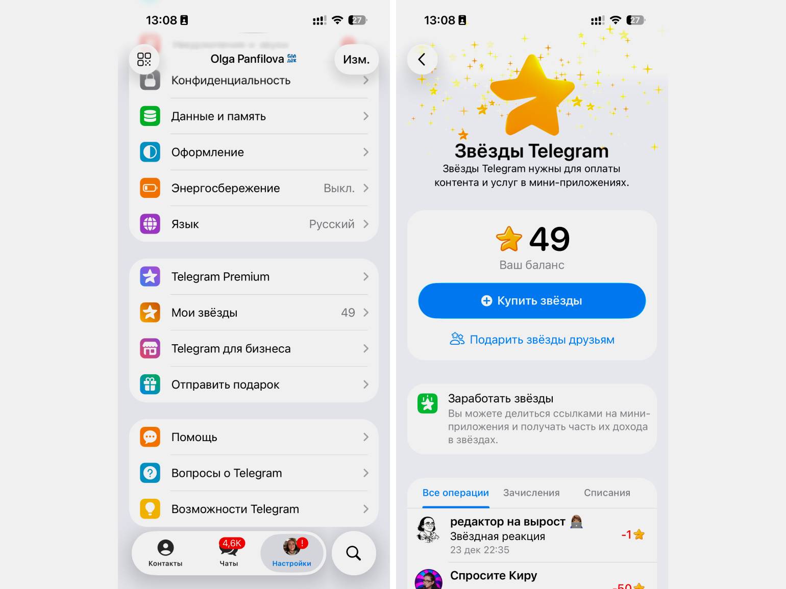 Все звёзды, которые есть у пользователя, привязаны к его профилю. В разделе настроек «Мои звёзды» можно проверить, сколько звёзд у вас есть, пополнить баланс или посмотреть историю операций.