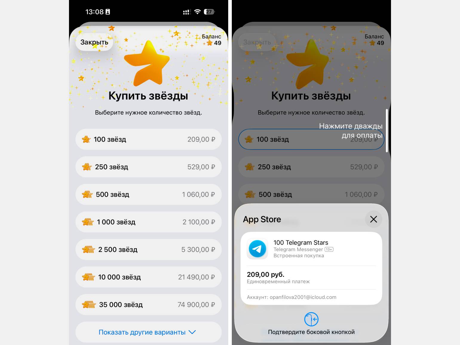 Мы рассмотрим покупку звёзд через магазин Apple. Для покупки откройте Telegram, нажмите «Настройки» → «Мои звёзды». Выберите нужное количество и оплатите его. За 100 звёзд придётся отдать 209 рублей.