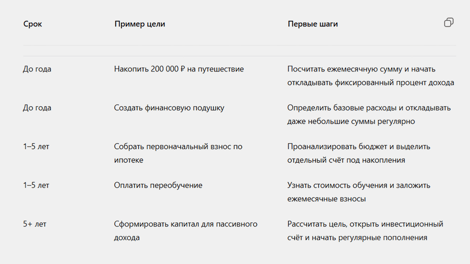 На практике одна и та же цель может решать сразу несколько задач. Например, накопление на квартиру может быть долгосрочной целью и при этом выполнять защитную функцию, а инвестиции — работать и на рост капитала, и на будущую стабильность. Это нормально и не мешает планированию, если понимать, какую задачу цель решает именно сейчас.