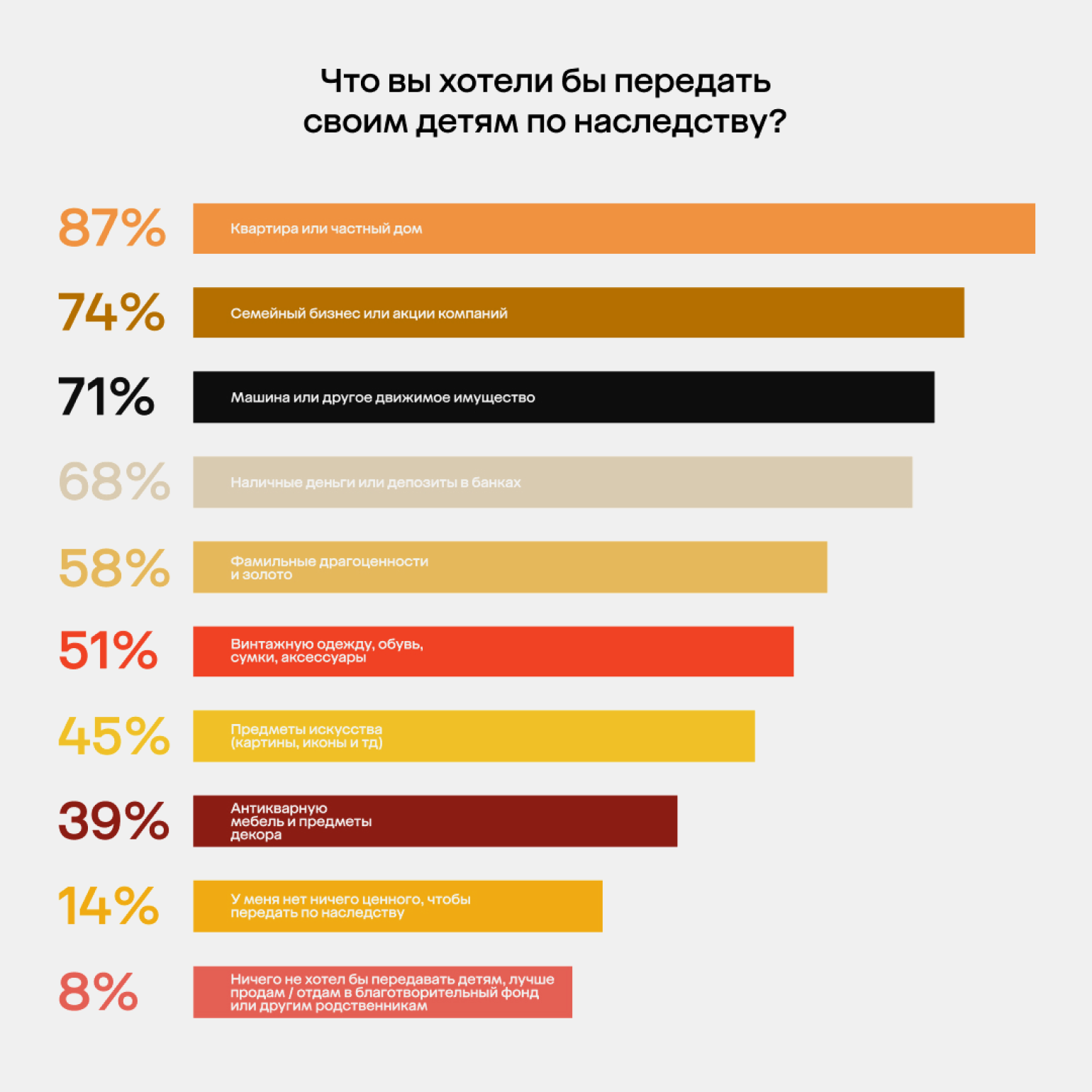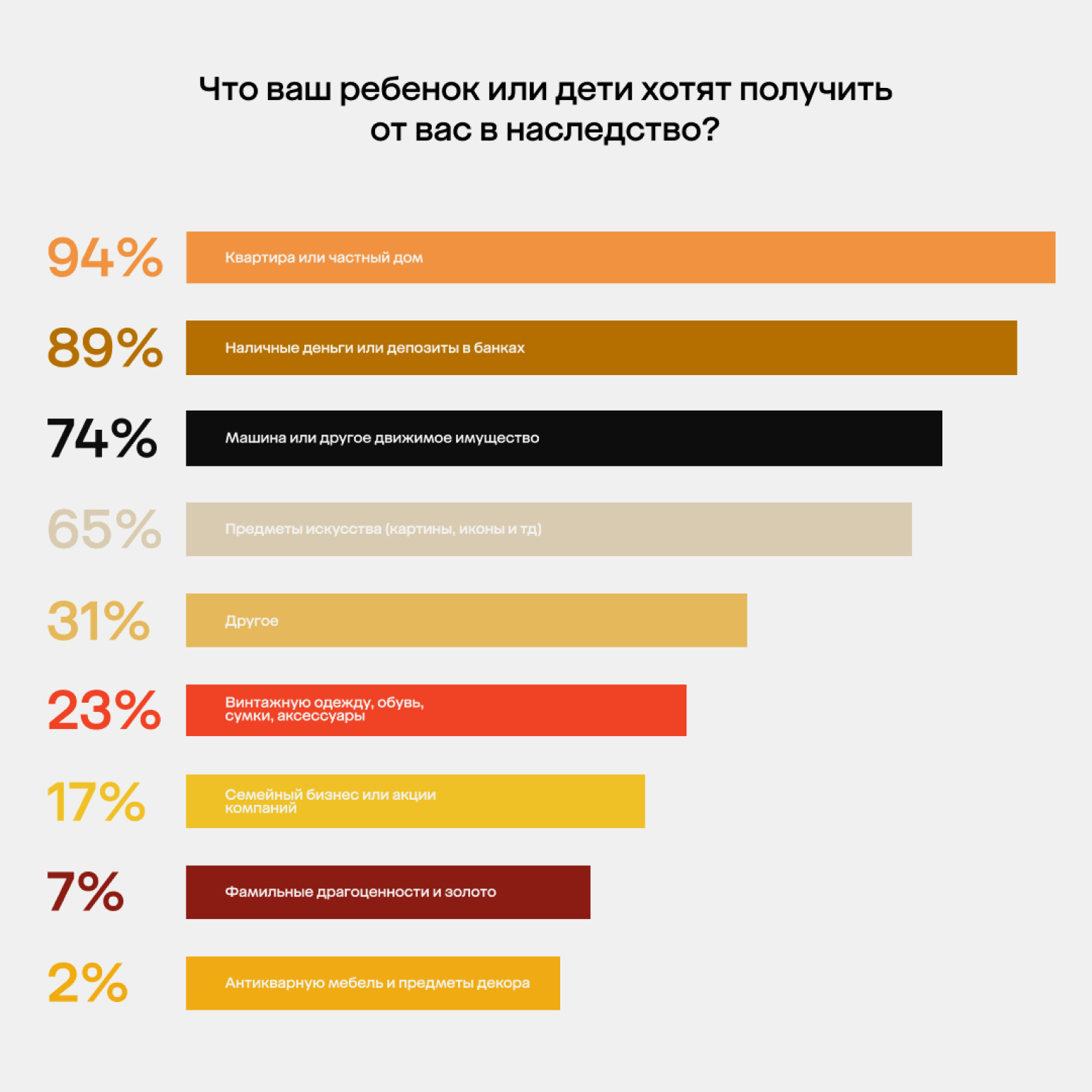 Большинство родителей придерживаются традиционного подхода к наследству. Так, 87% хотели бы оставить квартиру или частный дом. Семейный бизнес или акции компаний мечтают завещать 74%, автомобиль — 71%, а банковские накопления в виде наличных или депозитов — 68%.