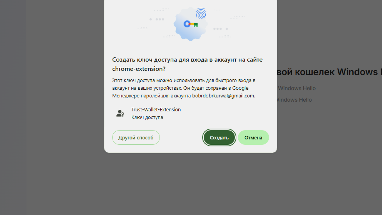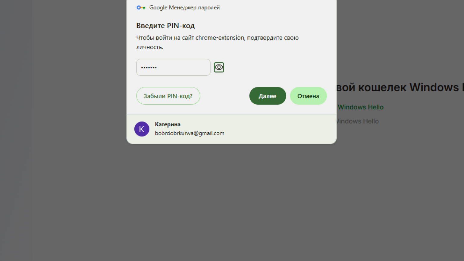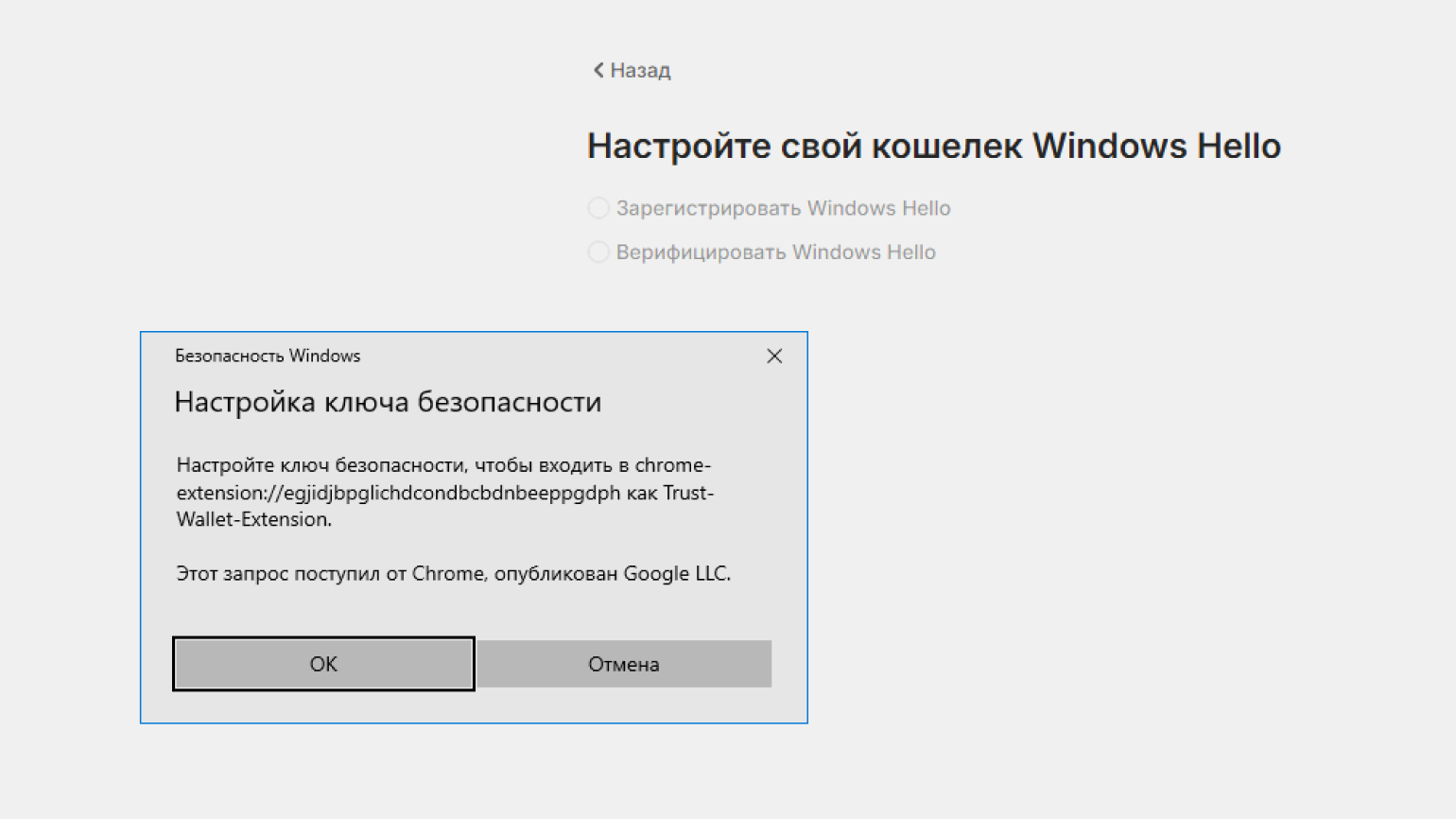Чтобы создать кошелёк, можно использовать Windows Hello — то есть привязать кошелёк к биометрическим данным или PIN-коду в операционной системе Windows. А можно придумать только пароль — не менее восьми символов.