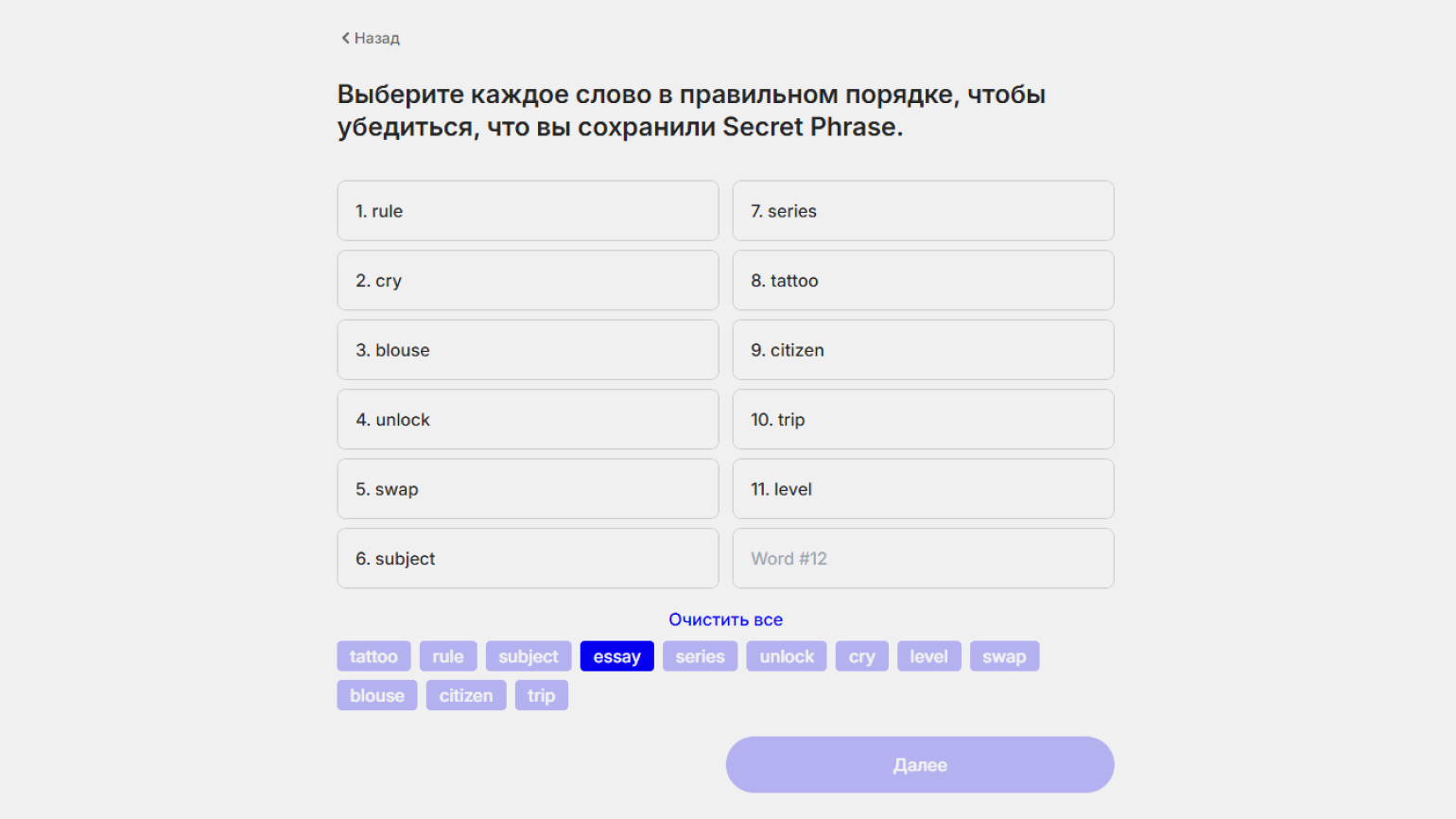 Кликните по уведомлению. Сервис запросит PIN-код, а затем предложит показать сид-фразу. Подготовьте бумагу и ручку, чтобы переписать её. Нужно выписать слова, нажать на кнопку «Продолжить», а затем вписать их снова в поля сервиса в том же порядке. После этого уведомление исчезнет.
