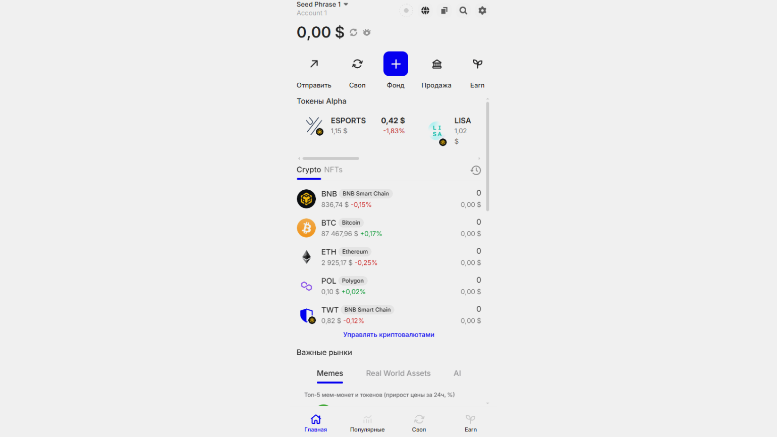 Это удобный вариант для новичков, но он создаёт риски для безопасности. Если биржу взломают, заблокируют или начнут преследовать из-за каких-то нарушений, вы можете временно или навсегда потерять доступ к средствам. Поэтому опытные криптоинвесторы часто предпочитают некастодиальные кошельки.