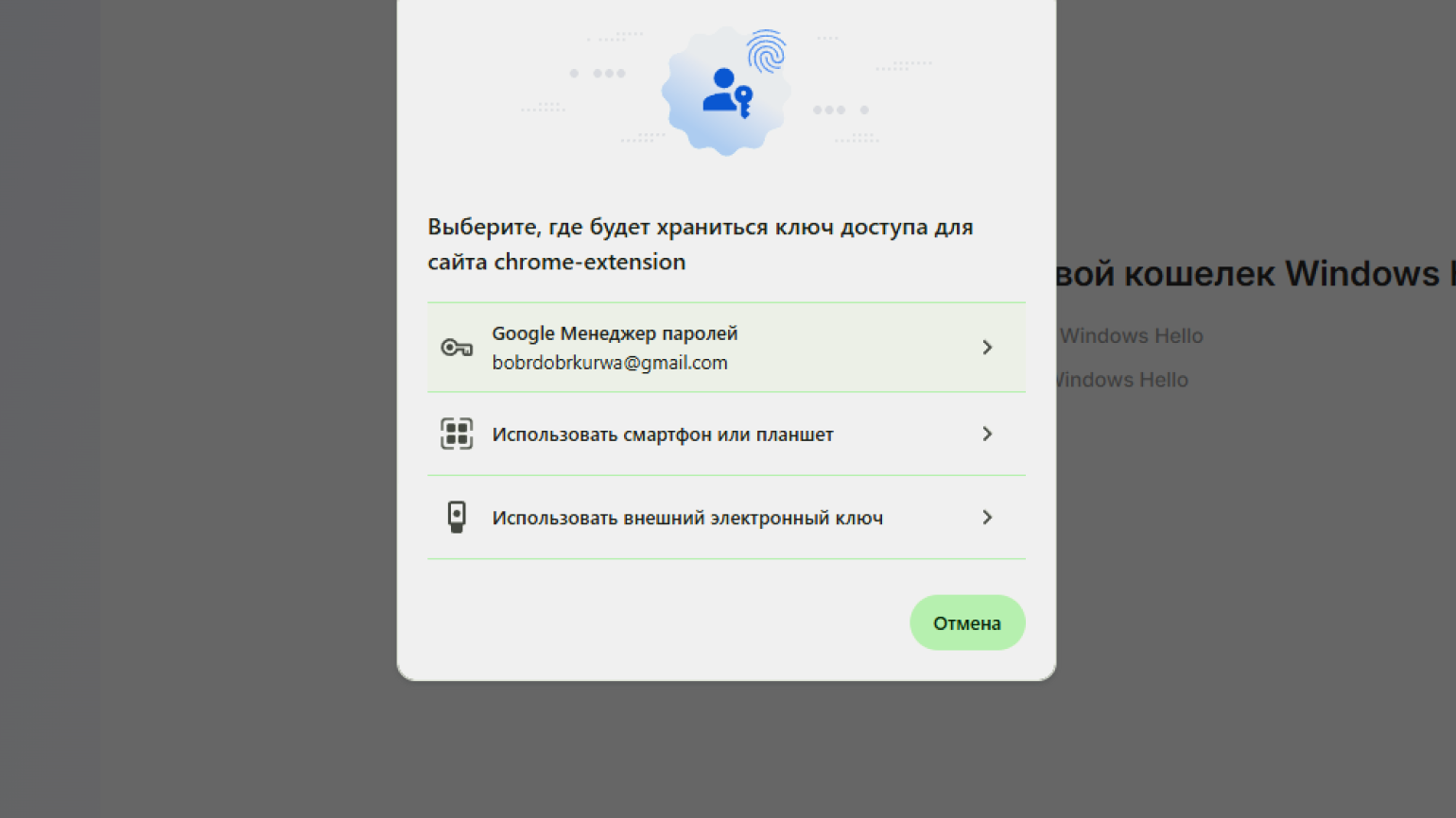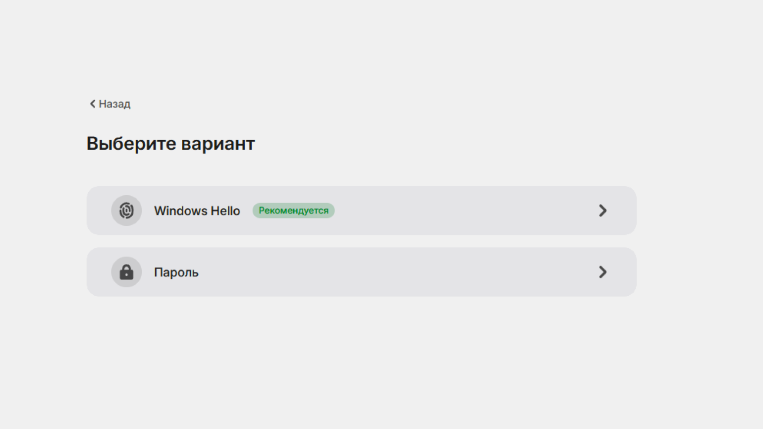 Пропустить шаг нельзя — нужно обязательно выбрать один из предложенных вариантов. Мы выбрали хранить пароль в браузере, чтобы показать, как работает сервис, но так лучше не делать: ключ будет более уязвим, чем при хранении в виде QR или внешнего электронного ключа.