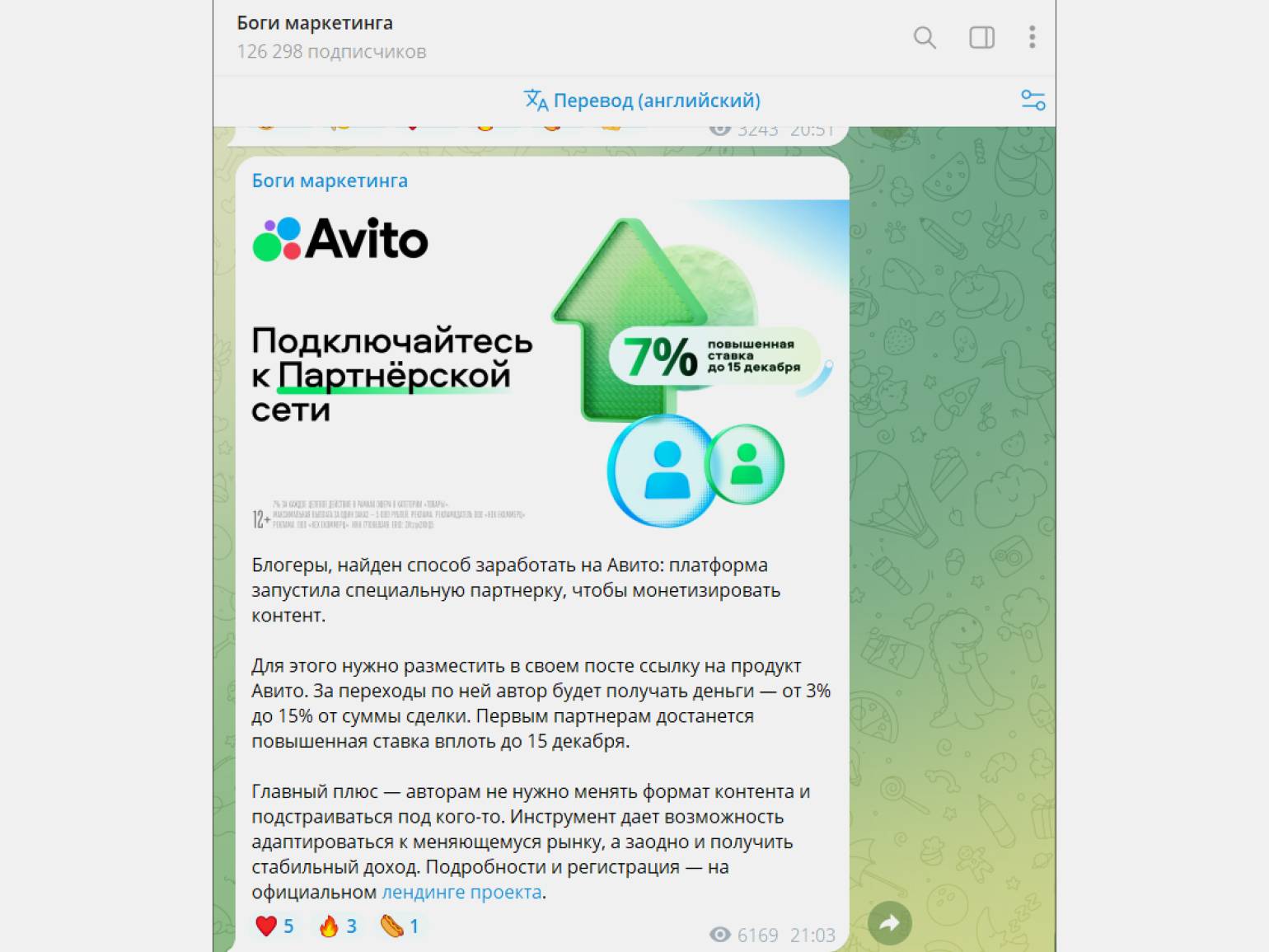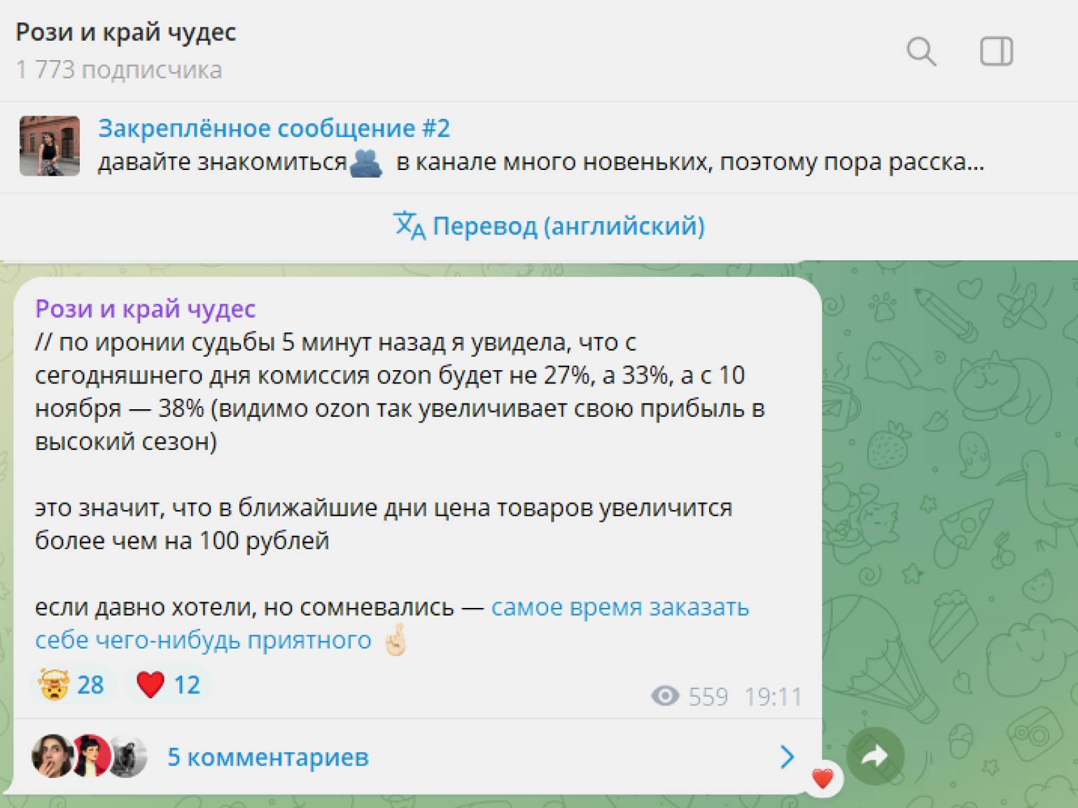 На цену также влияет ниша — например, в каналах про бизнес, инвестиции и маркетинг размещение обычно стоит дороже. Так, в канале «Молянов» на момент публикации статьи 24 400 подписчиков, а реклама стоит 37 000 рублей. В канале «Инструменты редактора Марфицина» про копирайтинг на 11 000 подписчиков рекламный пост стоит от 6990 до 9990 рублей.