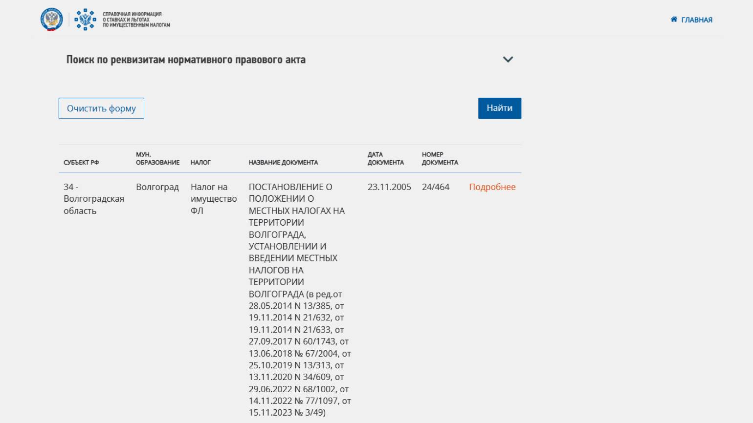 Откроется окно с результатами поиска. В нём будут реквизиты нормативного документа, который устанавливает ставки налогов и льготы в регионе. Если нажать кнопку «Подробнее», откроется страница с тремя вкладками: «Ставки», «Местные льготы», «Федеральные льготы». Можно ознакомиться с информацией и проверить расчёты.