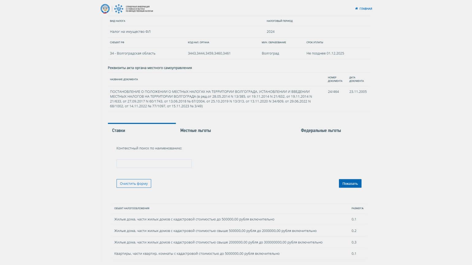 Скриншот: «Справочная информация о ставках и льготах по имущественным налогам» / ФНС России / Skillbox Media