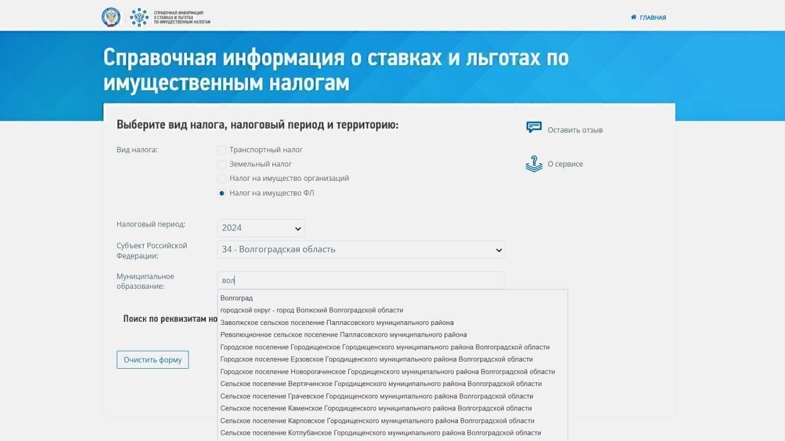 Для этого в форме на сайте справочного сервиса нужно выбрать вид налога, нужный регион и ввести первые три буквы названия населённого пункта в окно поиска. Из выпадающего списка выбрать нужный город или муниципальное образование и нажать на кнопку «Найти».