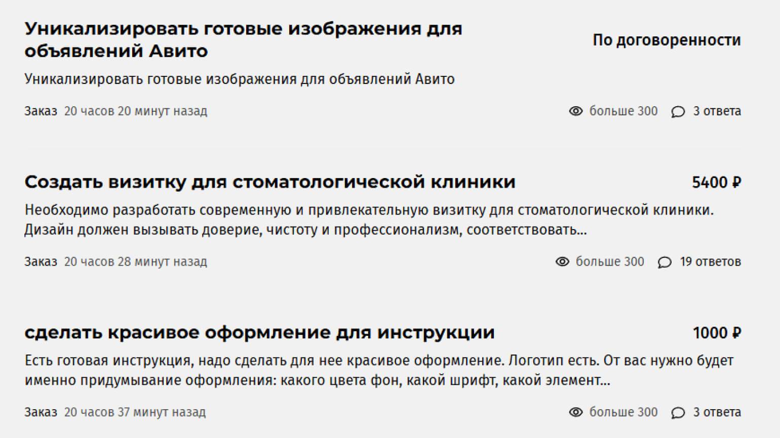 Сайты с объявлениями. Например «Авито» и «Яндекс Услуги». На них можно не только искать задания, но и разместить собственное резюме, чтобы заказчики сами могли вас найти. Однако лучше не ждать, пока кто-то напишет, а активно откликаться на вакансии — так шансы получить заказ выше.