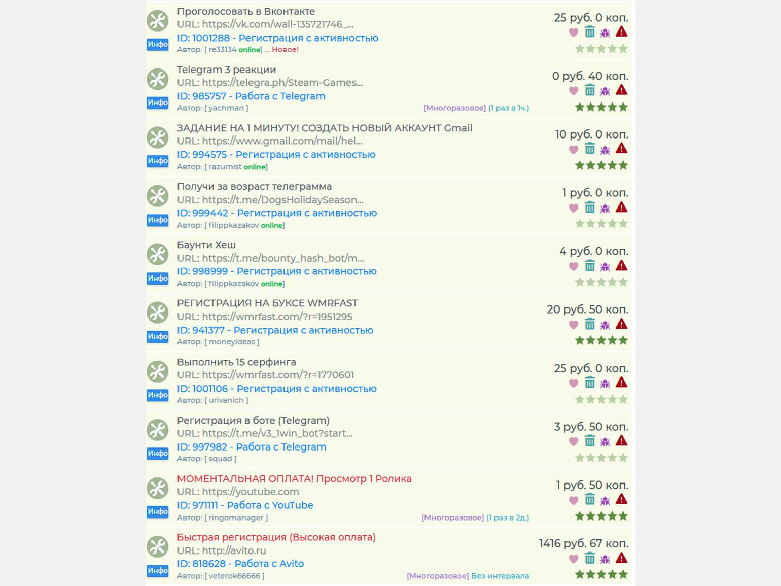 Такую работу может делать любой человек. Но и оплата за такие задачи небольшая. За простые действия вроде перехода по ссылке платят от 0,01 до 0,04 рубля, а за более сложные задачи (например, написать комментарий, установить приложение или опубликовать отзыв) можно получить 5–20 рублей.