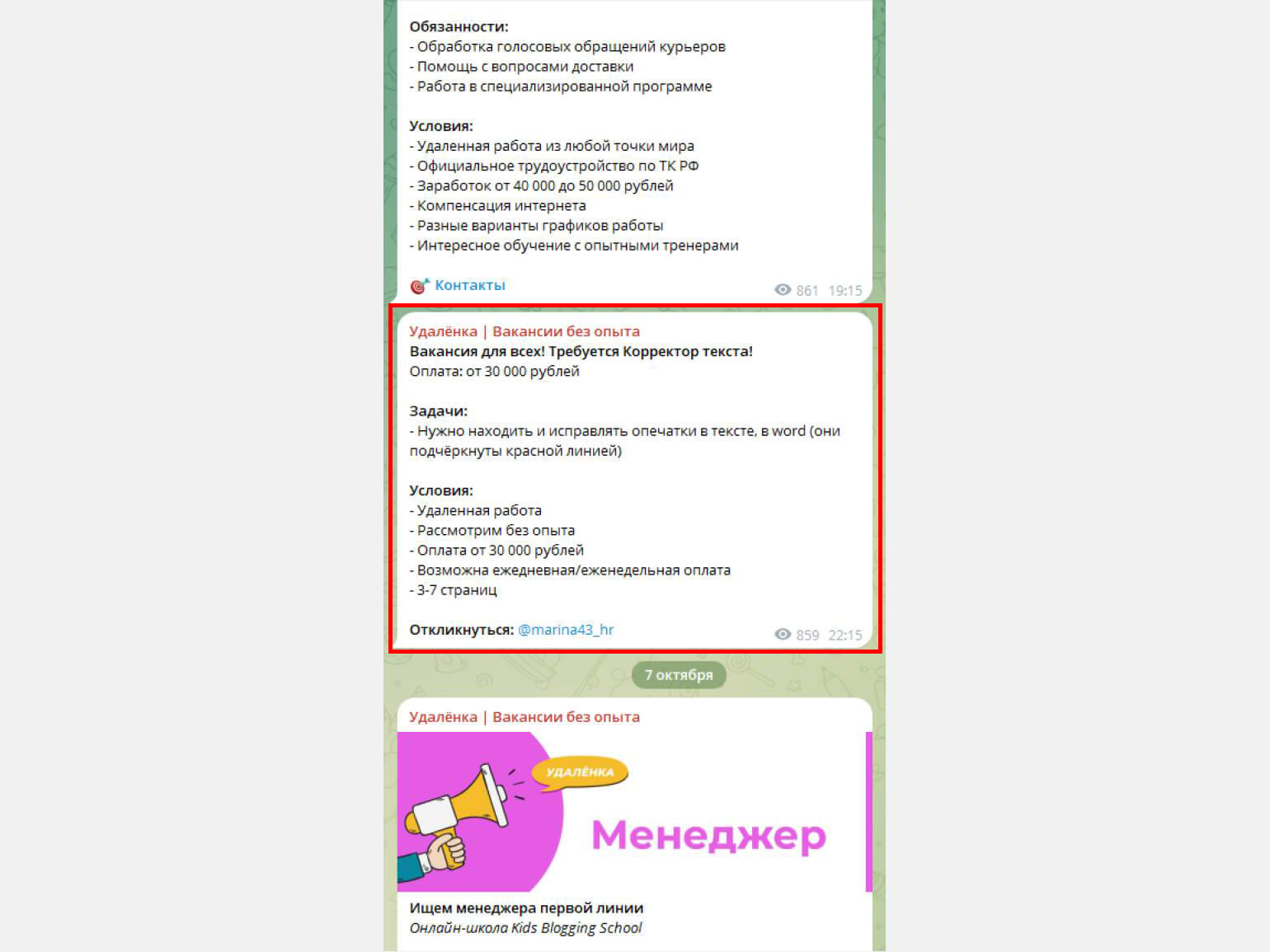 Чаще всего сомнительные вакансии можно встретить в чатах и каналах в Telegram, а также в группах по поиску работы в VK. На остальных площадках они встречаются реже, но всё равно нужно быть бдительным и не соглашаться на сомнительные предложения.