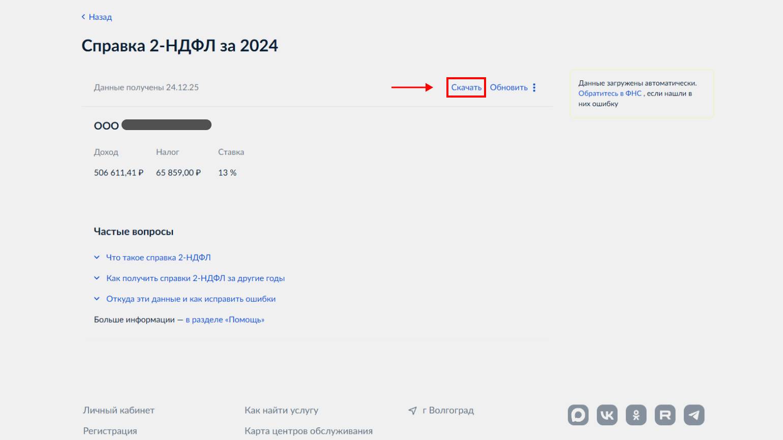 Если кликнуть на поле, в котором указан нужный год, откроется окно со справкой за этот период. Справку можно скачать в формате PDF — файл сформируется и загрузится мгновенно, он будет заверен визуальной копией УКЭП ФНС.