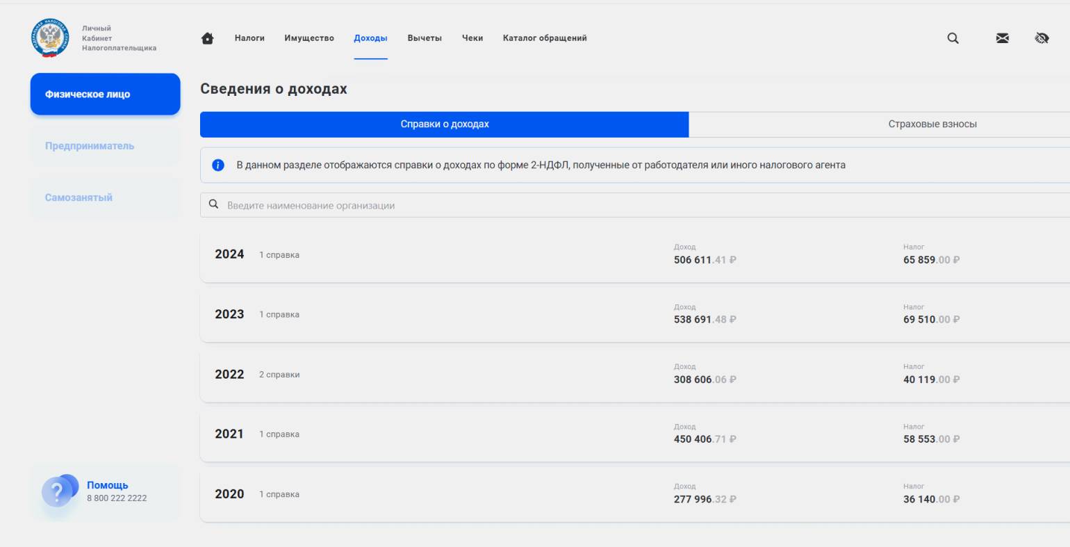 Нужно авторизоваться в личном кабинете налогоплательщика — например, с помощью подтверждённой учётной записи на «Госуслугах». На главной странице вверху выбрать раздел «Доходы» и перейти в него. Откроется раздел «Сведения о доходах» — в нём отображаются справки о доходах по форме 2-НДФЛ, полученные от работодателя или иного налогового агента за последние пять лет.