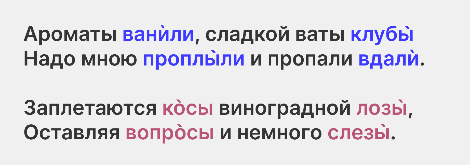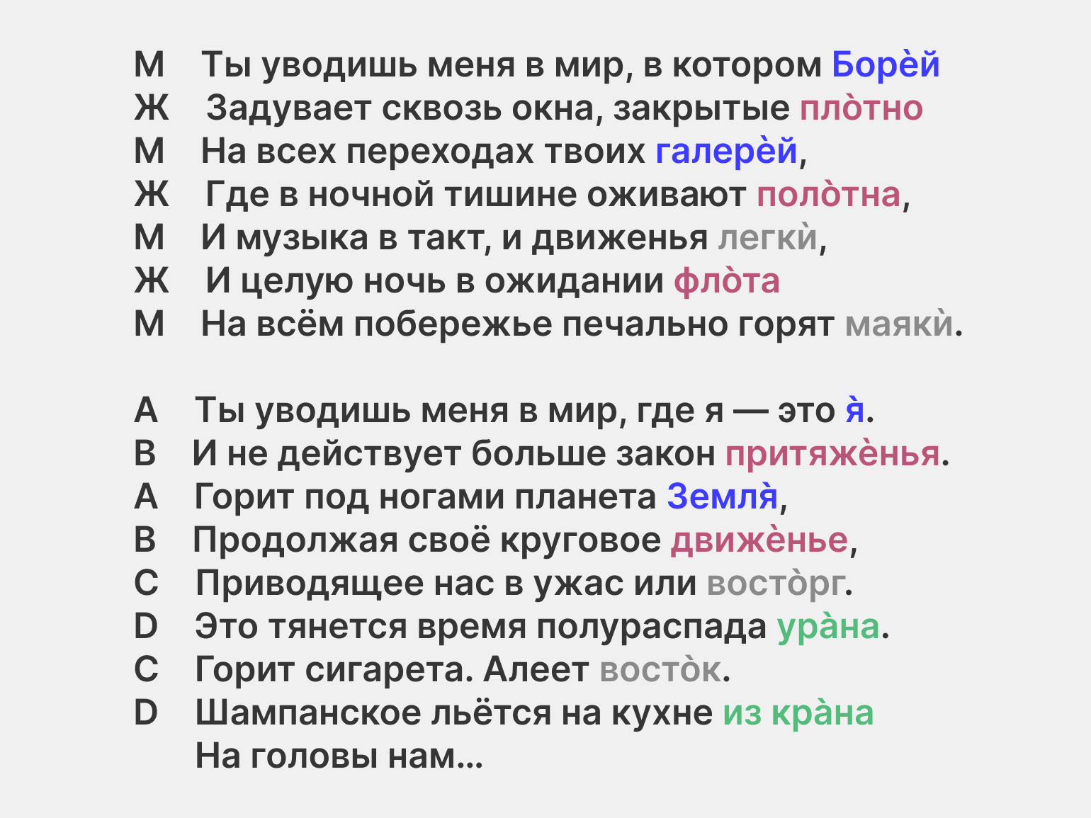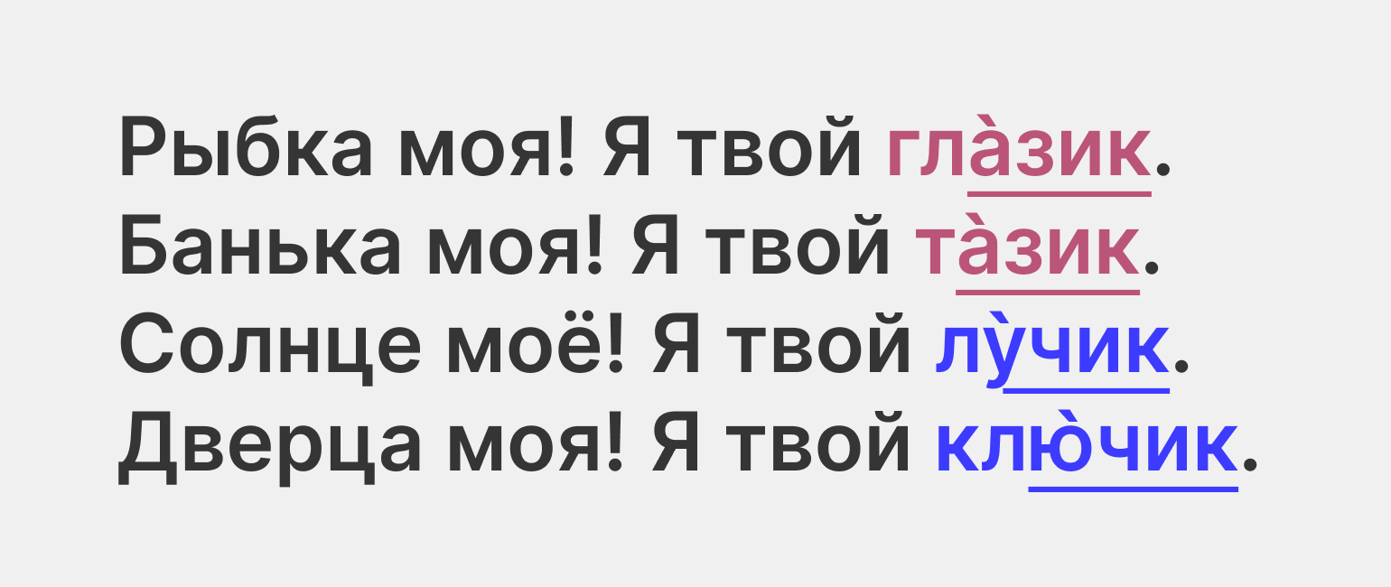 А теперь, зная все эти детали, попробуйте вернуть эти рифмы в их естественную среду — пропойте строчки про Ордынку и картинки. На ударения в этих словах падает ещё и главный акцент всей музыкальной фразы — и совпадающие слоги пропеваются ярко, звучно. А оставшаяся часть, где звуки различаются сильнее, попадают на «хвост» музыкальной фразы, где их почти не слышно. Поэтому, хоть рифма и неточная, в сочетании с музыкой она звучит хорошо.