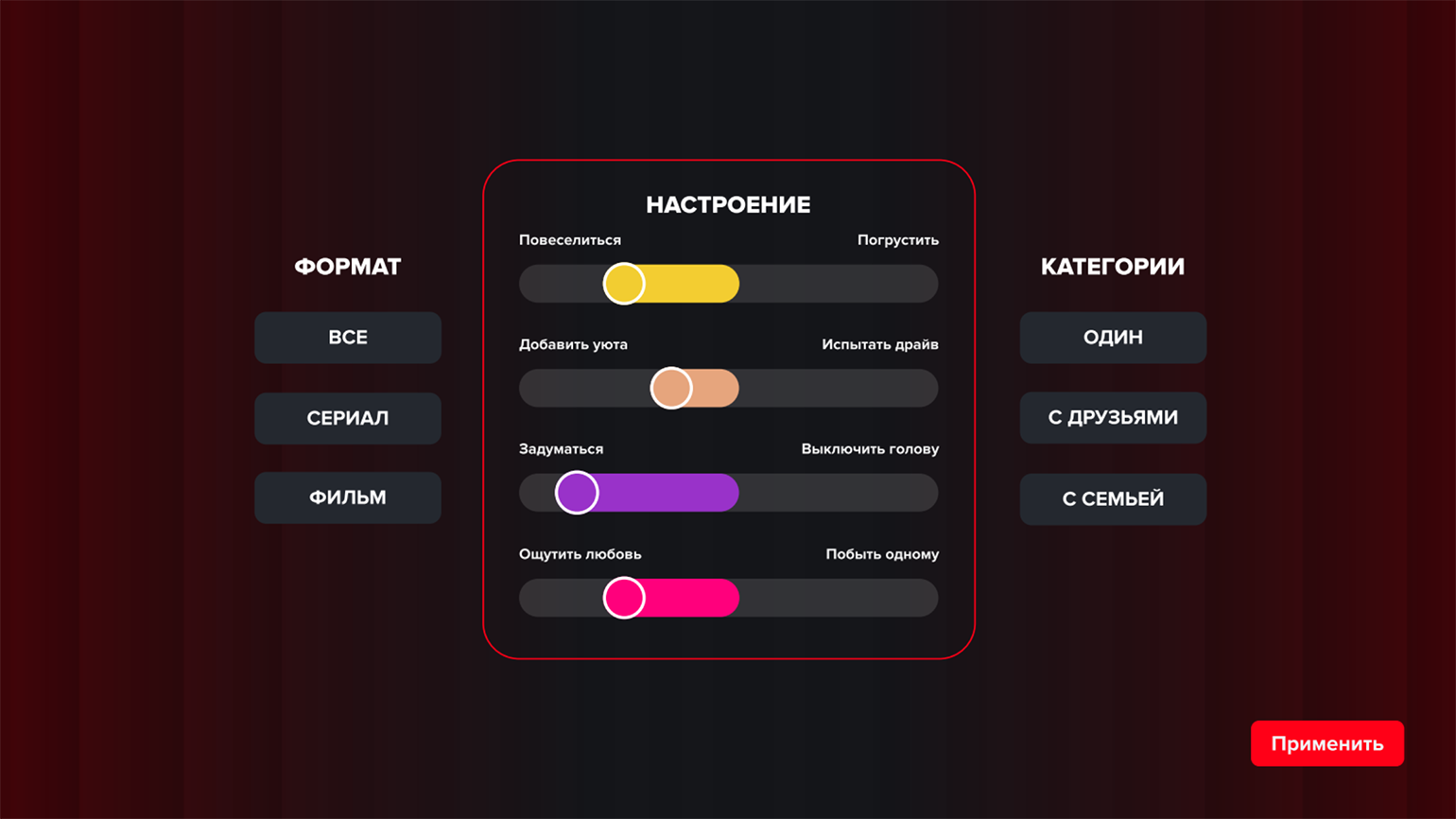 Система предлагает пользователю выбрать критерии его настроения и покрутить тумблеры, чтобы настроить предпочтения и получить выдачу с теми тайтлами, которые им соответствуют. Например, если люди в паре чувствуют мечтательный, окрылённый вайб и хотят ощутить любовь, алгоритм подберёт для них список уютных ромкомов.