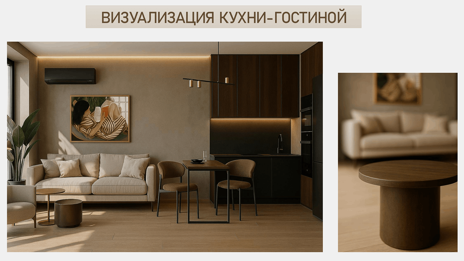 Победительницей конкурса стала студентка курса по интерьерному дизайну Ольга Осипенко. Чтобы сделать интерьер уютным, Ольга выбрала тёплый серый цвет, песочный и графитовый, чтобы разбавить палитру. Акцент в интерьере она сделала на фактуру: стены покрыты декоративной штукатуркой, которая придаёт мягкую глубину и подчёркивает текстиль гостиной. Кухня — минималистичная и полностью встроенная. Полы — из светлого ламината, чтобы сделать комнату визуально легче.