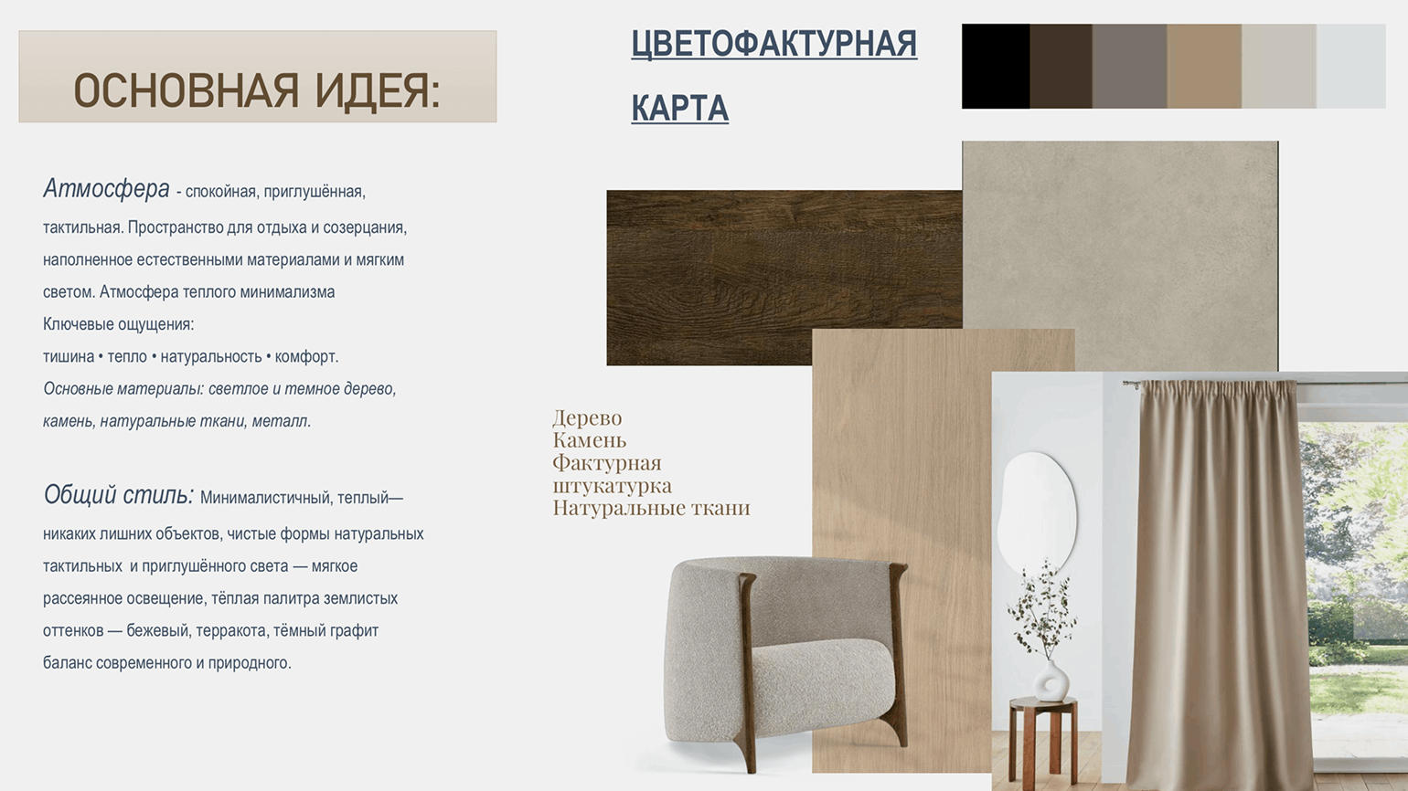 С учетом фидбэка от ментора студенты начали разрабатывать стилистическую концепцию. На этом этапе нужно было собрать реальные материалы, мебель и оборудование, которые можно использовать в дизайне; создать мудборд, коллаж или визуализацию; оформить итоговую презентацию для заказчика.