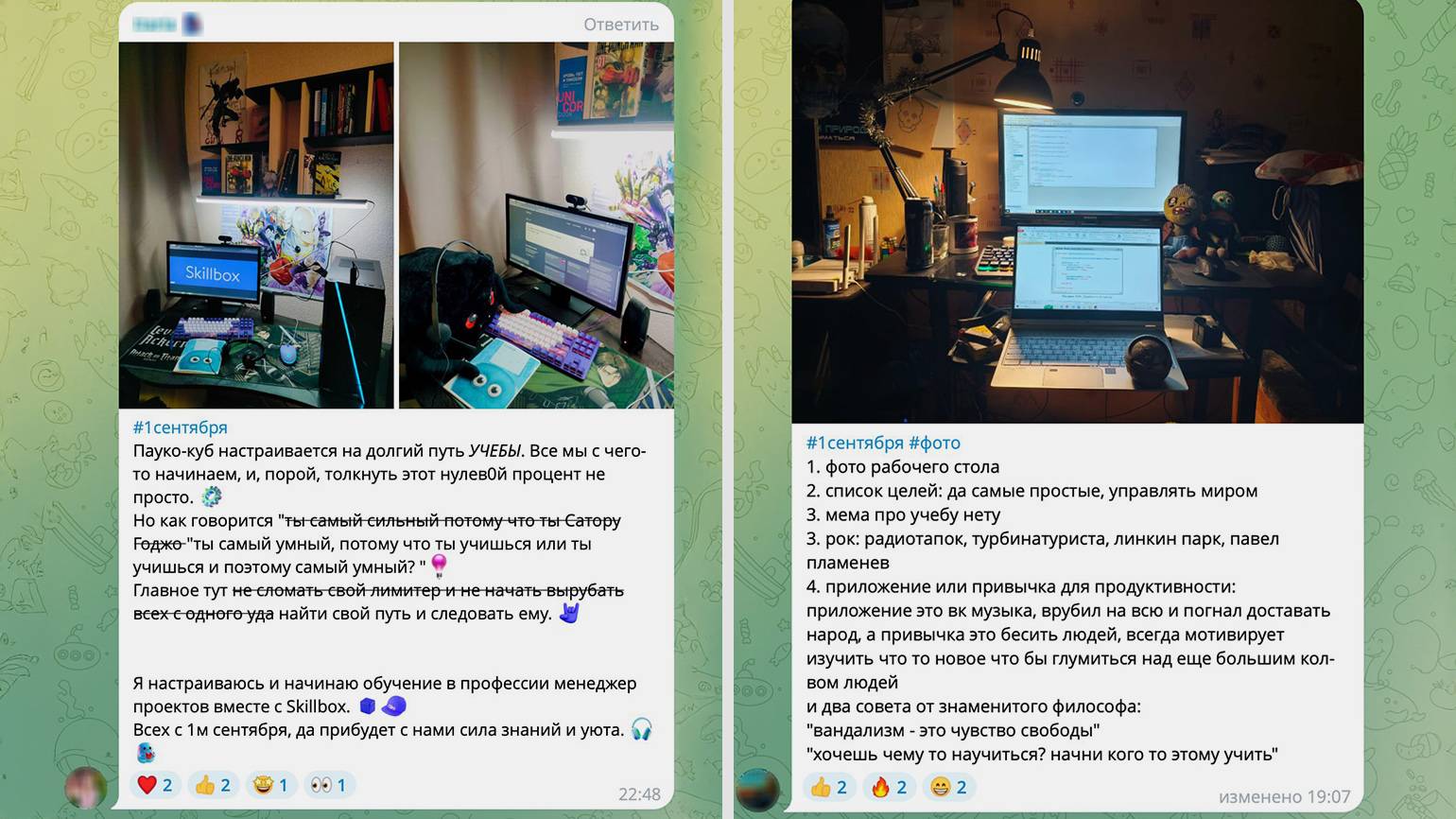 В чатах курсов кипела жизнь: участники делились фотографиями своих рабочих мест, подкидывали мемы, обменивались плейлистами для фокуса и делились лайфхаками продуктивности.