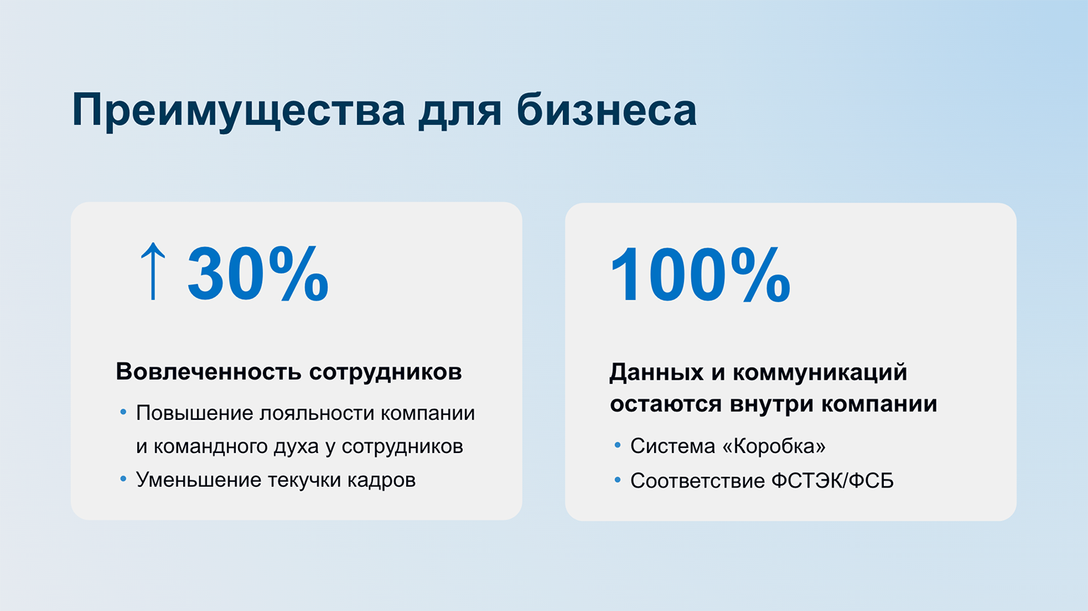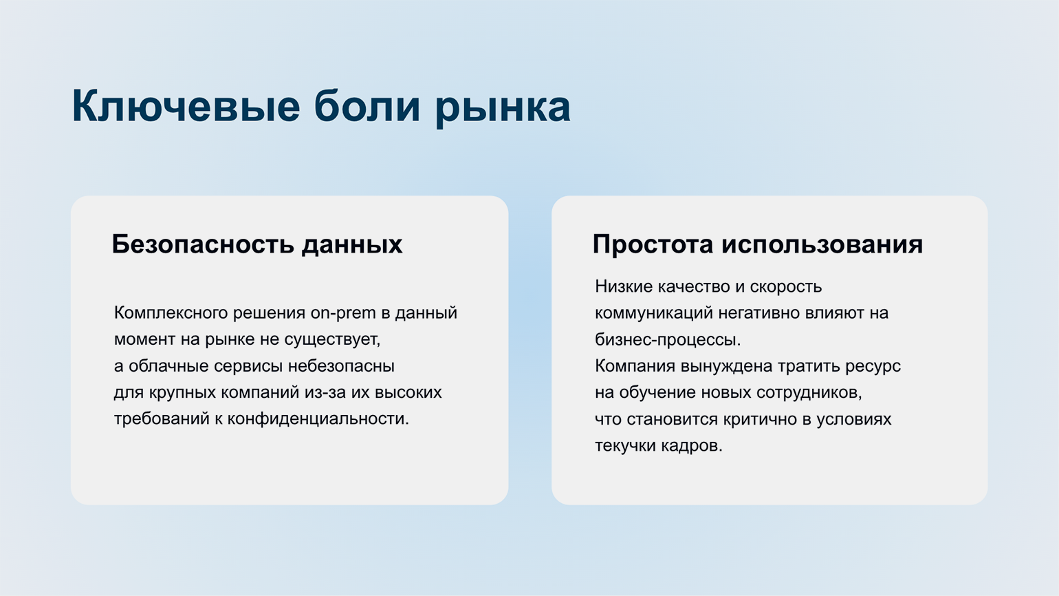 Студенты начали удивлять уже на презентации. Ребята выстроили свой нарратив очень последовательно. От анализа сегмента корпоративных коммуникаций перешли к проблемам клиента и предложили свой продукт как то, что «перевернёт правила игры на рынке». Эту амбициозную задачу на презентации озвучили тимлид Леся Шарф и продакт-менеджер Пётр Хакназаров. Такое начало заинтриговало экспертов ещё сильнее.