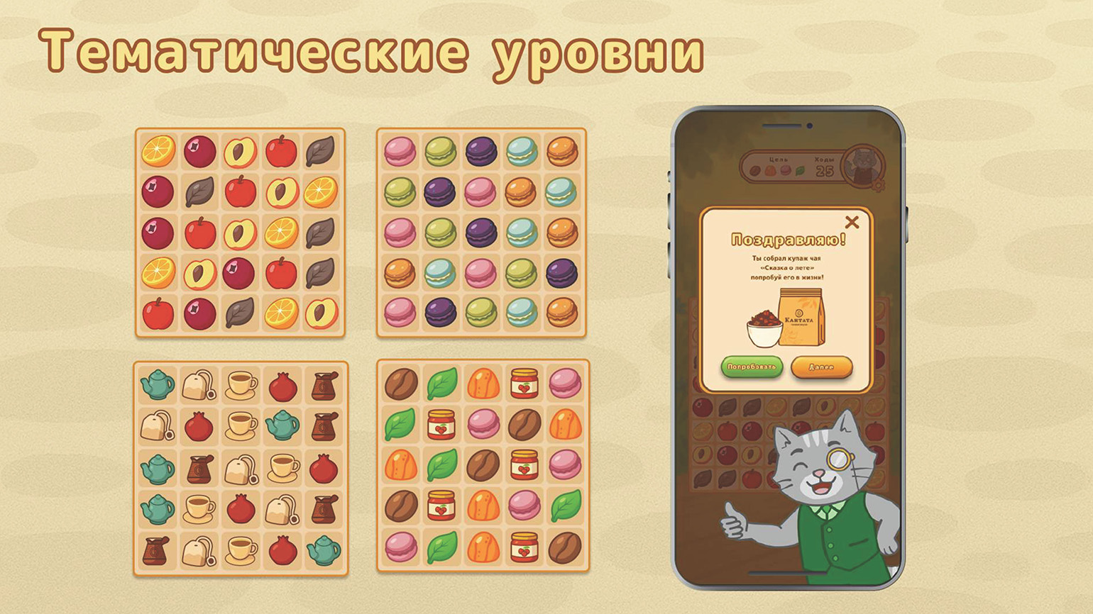 - Серия уровней про конкретный чай — например, «Сказка о лете». В игровое поле включили характерные ингредиенты (персик, яблоко, ягоды), а финал уровня сопровождается предложением попробовать этот чай в реальности.