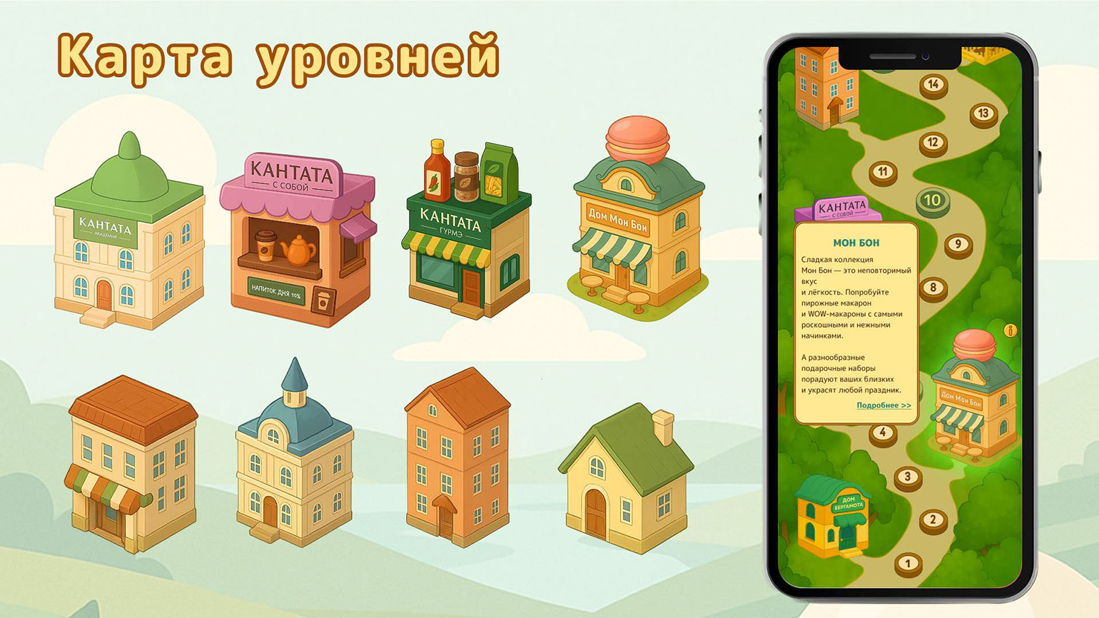 Финальным решением стало адаптивное веб-приложение с игровой механикой «вкус в ряд» — вариацией жанра «три в ряд», адаптированной под ассортимент и стилистику «Кантаты». Механика строится вокруг знакомства с продуктами бренда: пользователь проходит уровни, собирает комбинации и постепенно открывает позиции компании в ненавязчивом игровом формате.