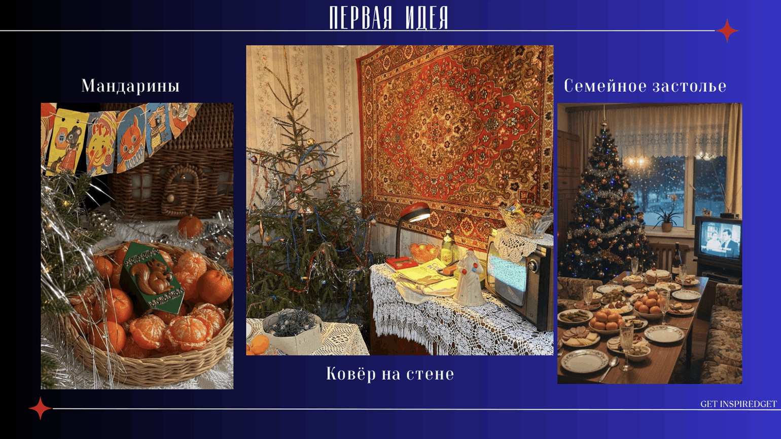 Сначала студентка вдохновлялась знакомым многим образом — уютным Новым годом у бабушки: мандарины, ковры на стенах, семейное застолье. Но после брифинга с организаторами сменила концепцию на более современную и лаконичную, сделав ставку на простые формы, тёмный фон и сочетаемые материалы. Дополнительным источником вдохновения стал фирменный стиль школы Contented с его чёткой геометрией.
