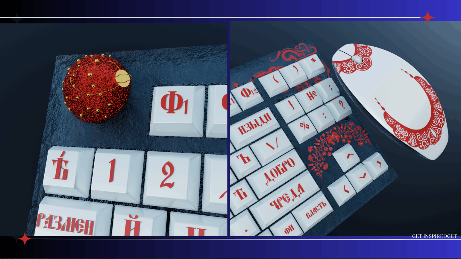 На этом Анастасия не остановилась. Вдохновившись хохломой, она перенесла традиционный орнамент на клавиатуру, а на мышь добавила узор в форме кокошника — его силуэт идеально повторил форму гаджета. В качестве кейкапа студентка использовала ёлочный шар, чтобы поддержать новогоднюю тему. Названия служебных клавиш — Shift и Enter — она тоже переосмыслила, переведя их на старославянский манер: «Чреда», «Добро».