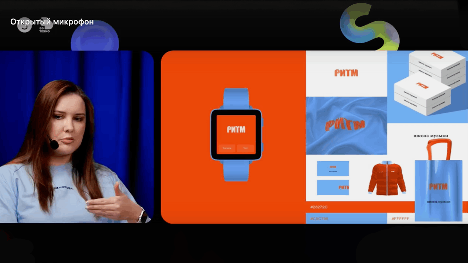 В перерыве между блоками по диджитал-дизайну и дизайну среды ведущая открытого микрофона Галина Лапина показала мини-ретроспективу защит итоговых проектов в Skillbox.